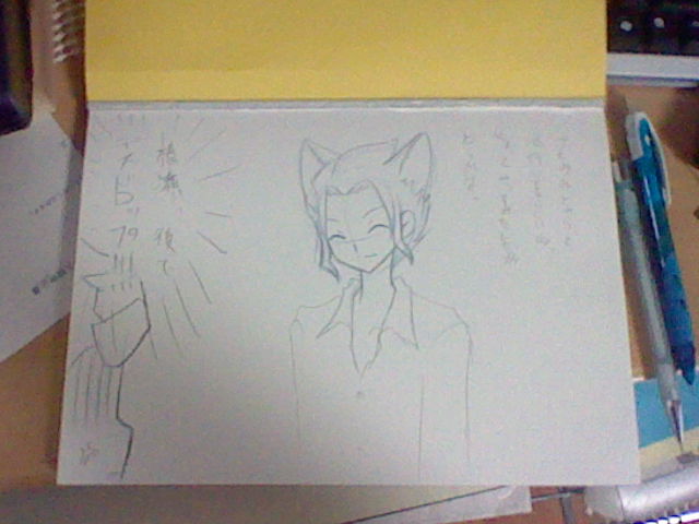 猫耳帽子。描ける子、みんなかぶせて、おっと、三国さんと天馬忘れたぁ。